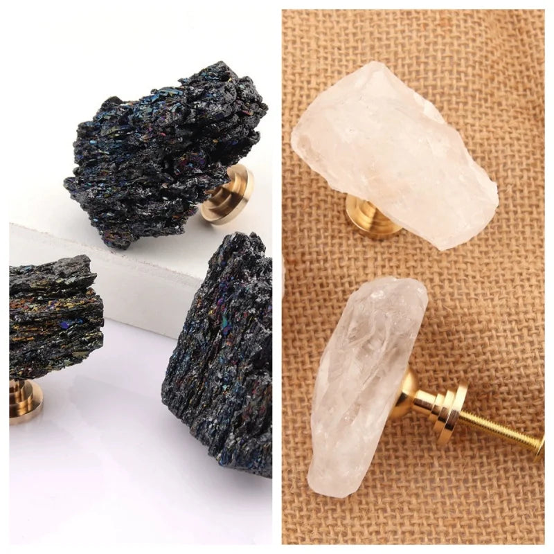 Transforme seu ambiente com o Puxador de Fluorita Natural com Base em Latão, uma peça que une design moderno e energia natural. Cada puxador é esculpido em pedra natural de fluorita, preservando suas nuances únicas de cor e forma, o que torna cada unidade exclusiva e autêntica.